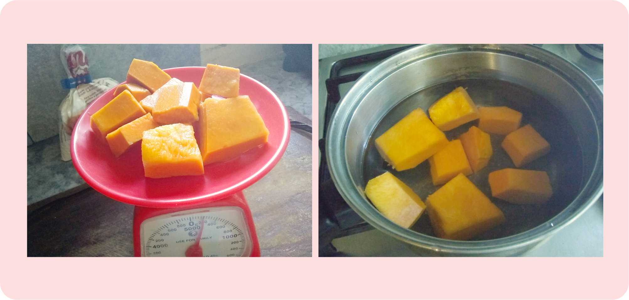 - Pelar la auyama (calabaza) y hervir en agua con sal.