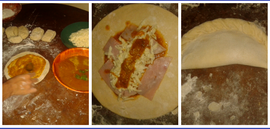 Al mismo estilo de la pizza, debemos dar forma circular a la masa y colocar una capa de salsa, queso mozarella, jamón, y doblar el ojaldre uniendo ambos extremos hasta formar un pastel, tomando en cuenta que se deben doblar los bordes.