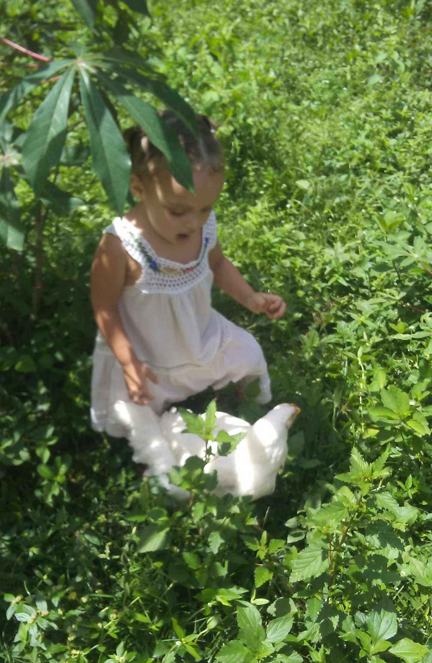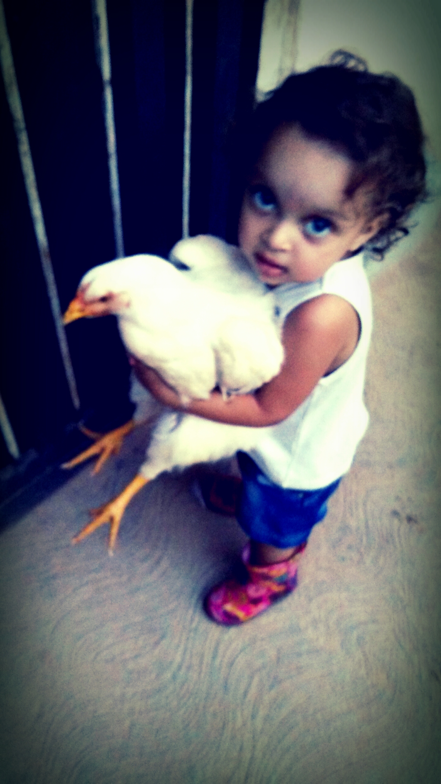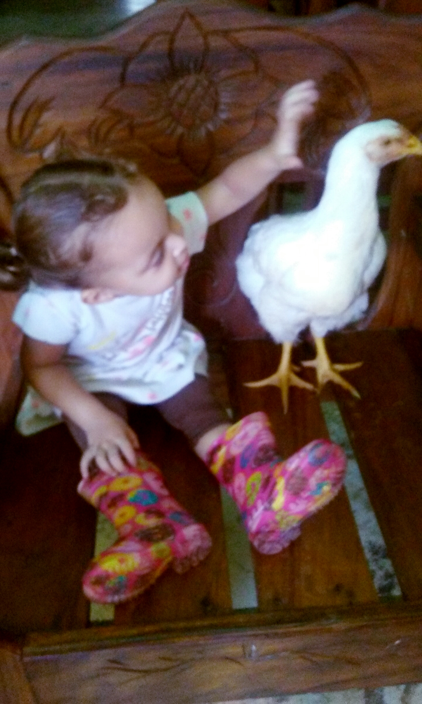 Descubrí que mi risitos de oro tiene un gran amor por los animales, pero tiene una conexión muy especial con un animalito un poco singular ¡¡un pollo!! sì, es una relación bastante extraña aunque adorable ya que muchos cuando piensan en una mascota para sus pequeños buscan compañeros mas comunes como un perro o un gato, aunque yo no escogí a Roberto el pollo como su compañero de aventuras "el solito la escogió a ella"...