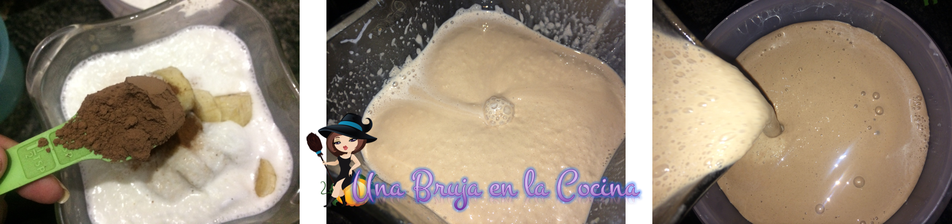 Agregamos el cacao en polvo, asegúrense de que sea soluble, pues el que usamos para repostería o de taza no es recomendable, porque es para usarlo en preparaciones cocidas. Procesamos en la licuadora por unos 5 minutos hasta que se hayan procesado por completo las bananas.