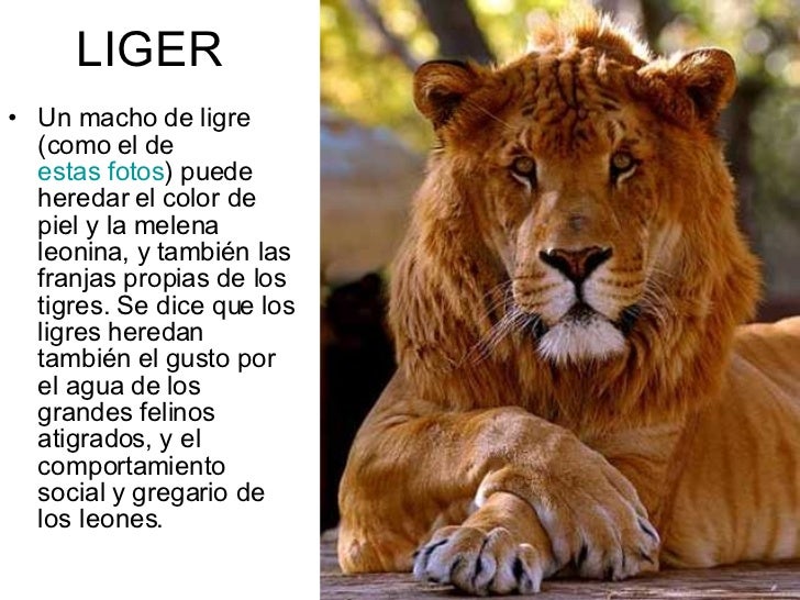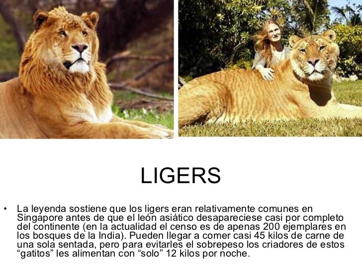 La cría de un león macho y una tigresa, el ligres, es un gato grande de color dorado con manchas en la frente, que se desliza a lo largo de la espalda y, en algunos machos, una crin rudimentaria. Estos enormes gatos, que tienen un peso de alrededor de 500 kilos y miden casi 4 metros de altura sobre sus patas traseras, tienen huesos más grandes y gruesos y dientes más largos que los leones y los tigres. En una situación natural, las leonas poseen el gen que limita el crecimiento, mientras que en los tigres es el macho; por lo tanto, los ligres (como la progenie de un león macho y un tigre hembra) no reciben una copia del gen de ninguno de sus padres y, en consecuencia, sufren de gigantismo, muy rápidamente superando a su madre y su padre. Un cachorro de ligre de noventa días, por ejemplo, está alrededor un mes por delante de su contraparte tigre en términos de tamaño; para cuando haya crecido completamente, el ligre tendrá casi el doble del tamaño de un tigre siberiano adulto, lo que lo convierte en el gato más grande del mundo.