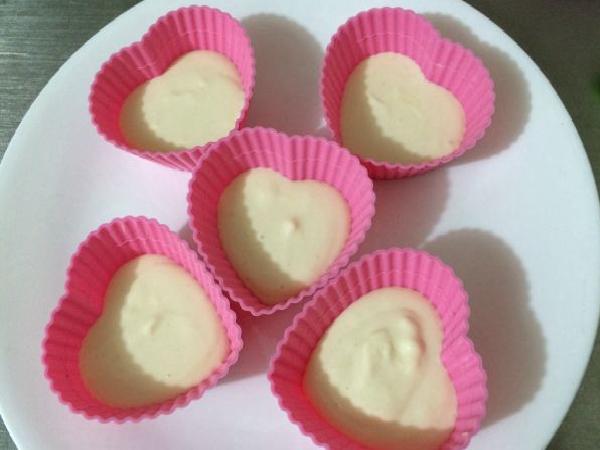 • Se agrega la mezcla en moldes pequeños, llenándolos hasta la mitad. Puedes usar los moldes con las formas de tu preferencia. Luego se llevan a la nevera y se refrigeran por un espacio de 1 hora o hasta que la gelatina haya compactado.