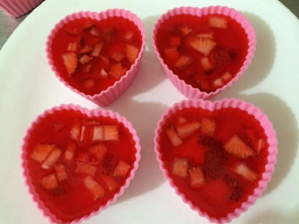 • Después disolvemos la gelatina de fresa en 150 mililitros de agua caliente, se mezcla muy bien, luego se le agrega 150 mililitros de agua fría, se deja reposar un poco y luego se añade a los moldes, luego se refrigera por una hora más o hasta que compacte.