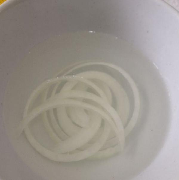 • Se pica la cebolla en rodajas y para bajar la intensidad de su sabor, se sumerge en un poco de agua con sal.