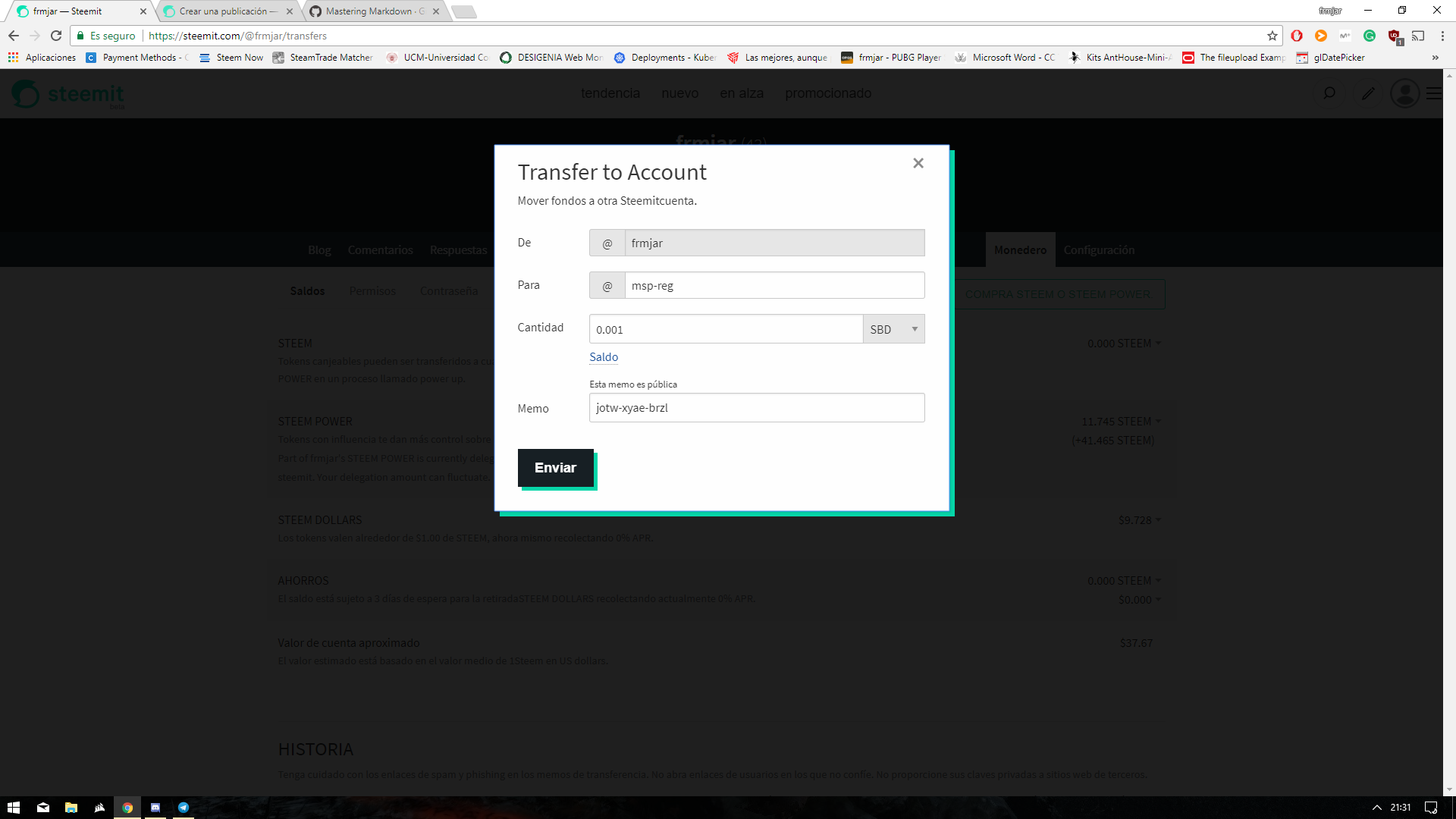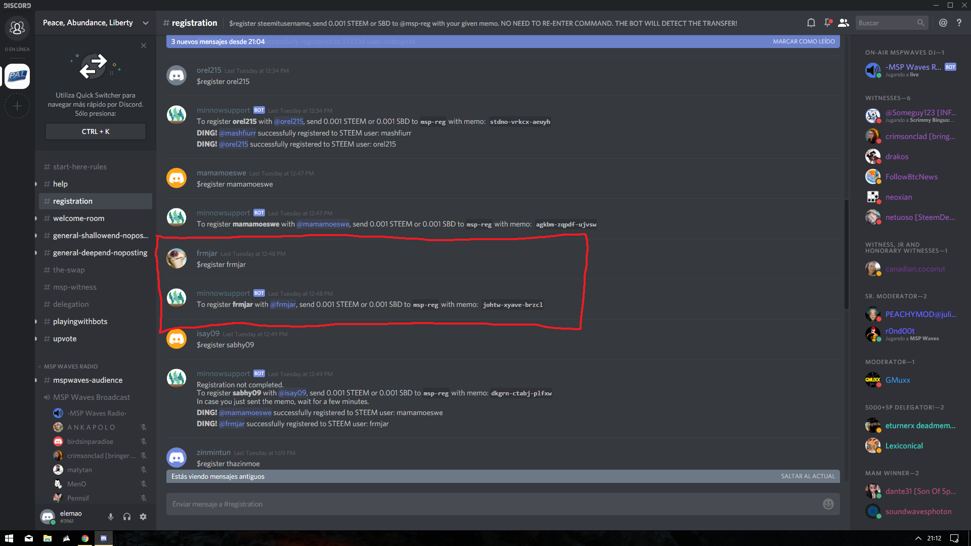 En mi caso concreto, el bot me mandaría este mensaje: To register frmjar with @frmjar, send 0.001 STEEM or 0.001 SBD to msp-reg with memo: jotw-xyae-brzl