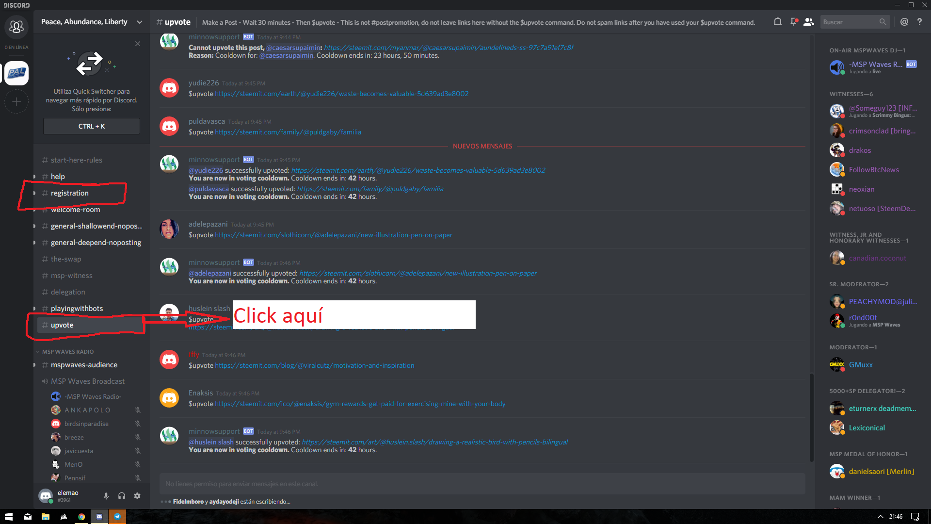 Una vez dentro de este canal, lo único que nos falta es poner el comando con el post que queremos que nos haga upvote.