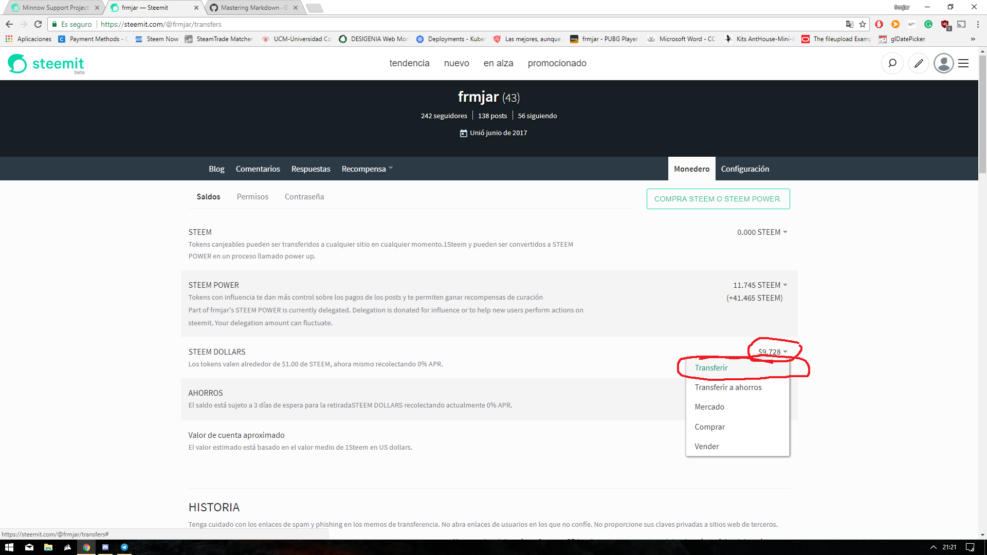 Para hacer el envío lo que hay que hacer es acceder a vuestra cuenta de Steemit e ir al monedero.