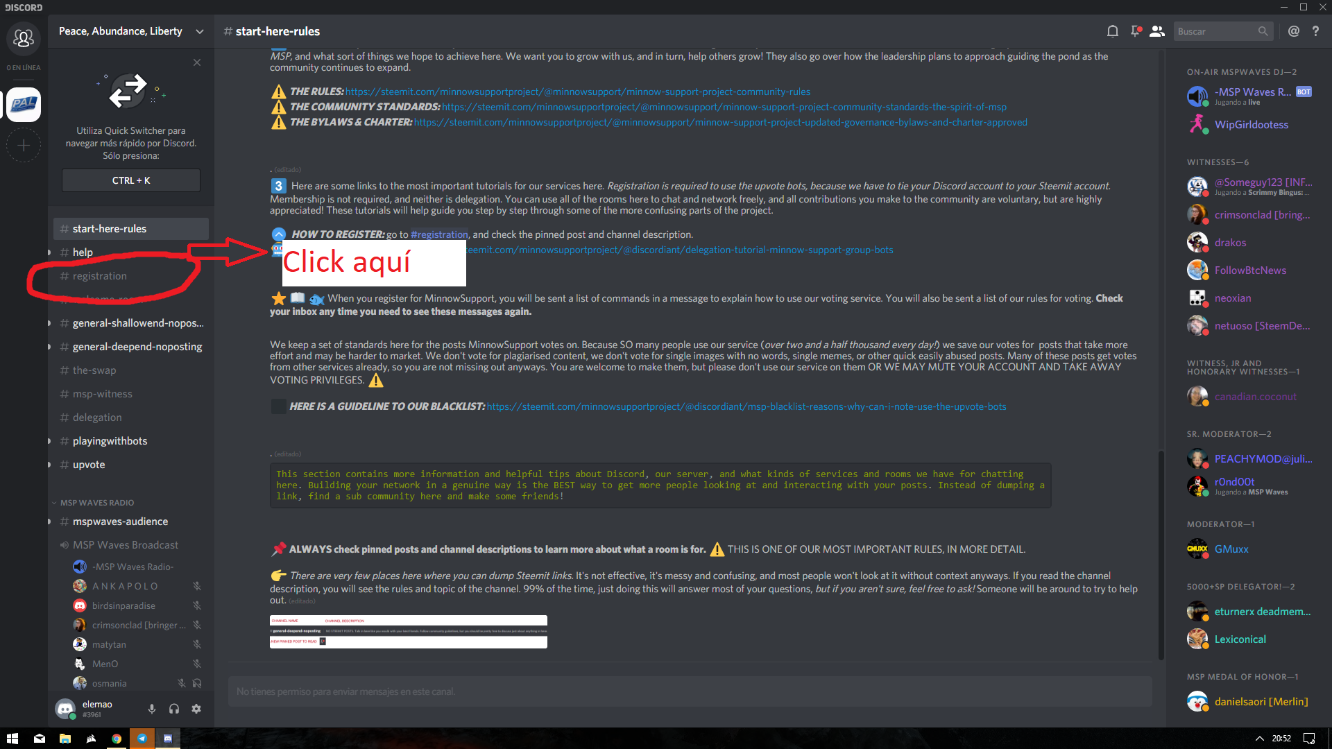 El segundo paso que hay que hacer es acceder al canal de registro. Para ello hacemos click en el canal de texto que pone # registration .