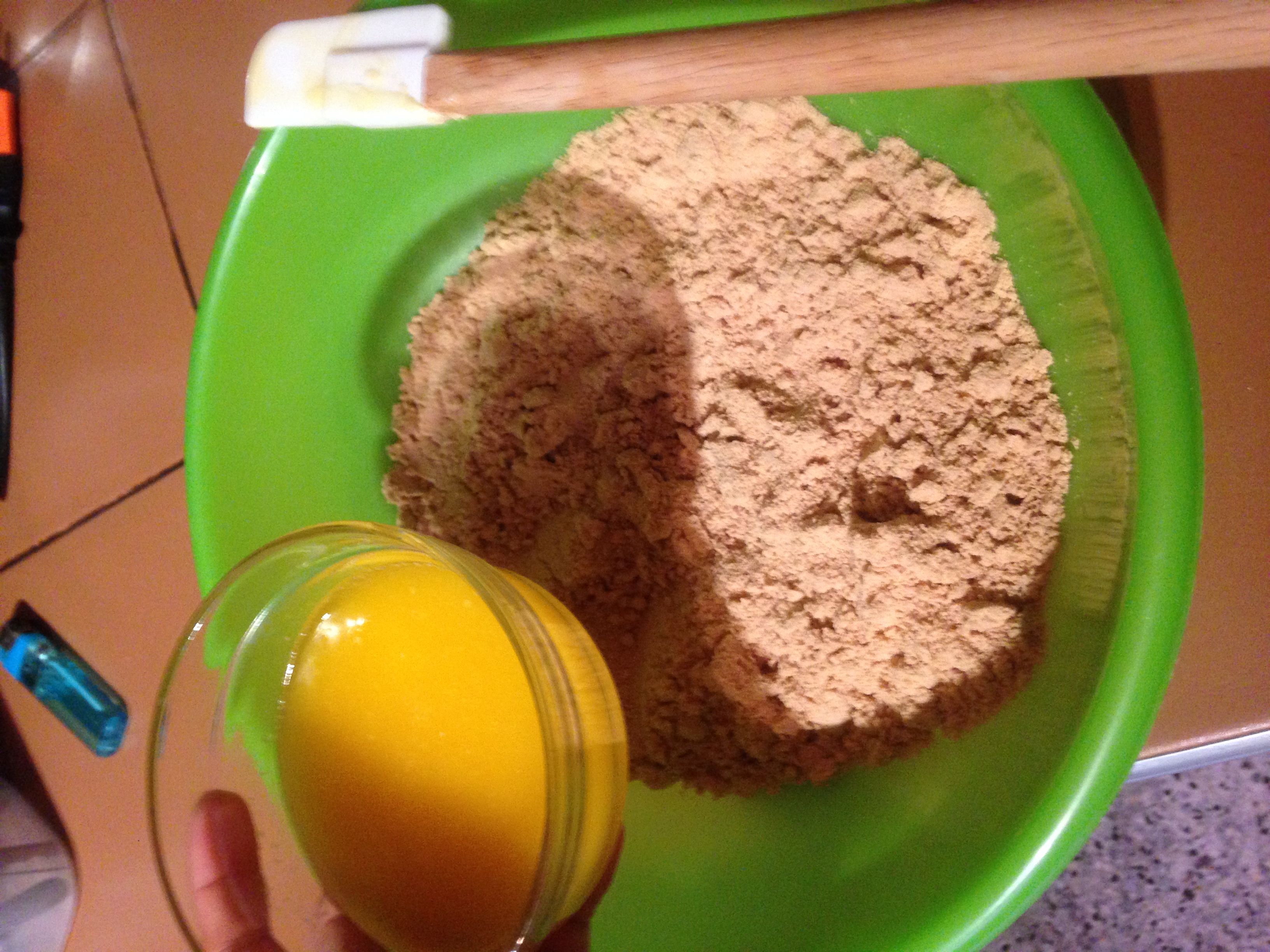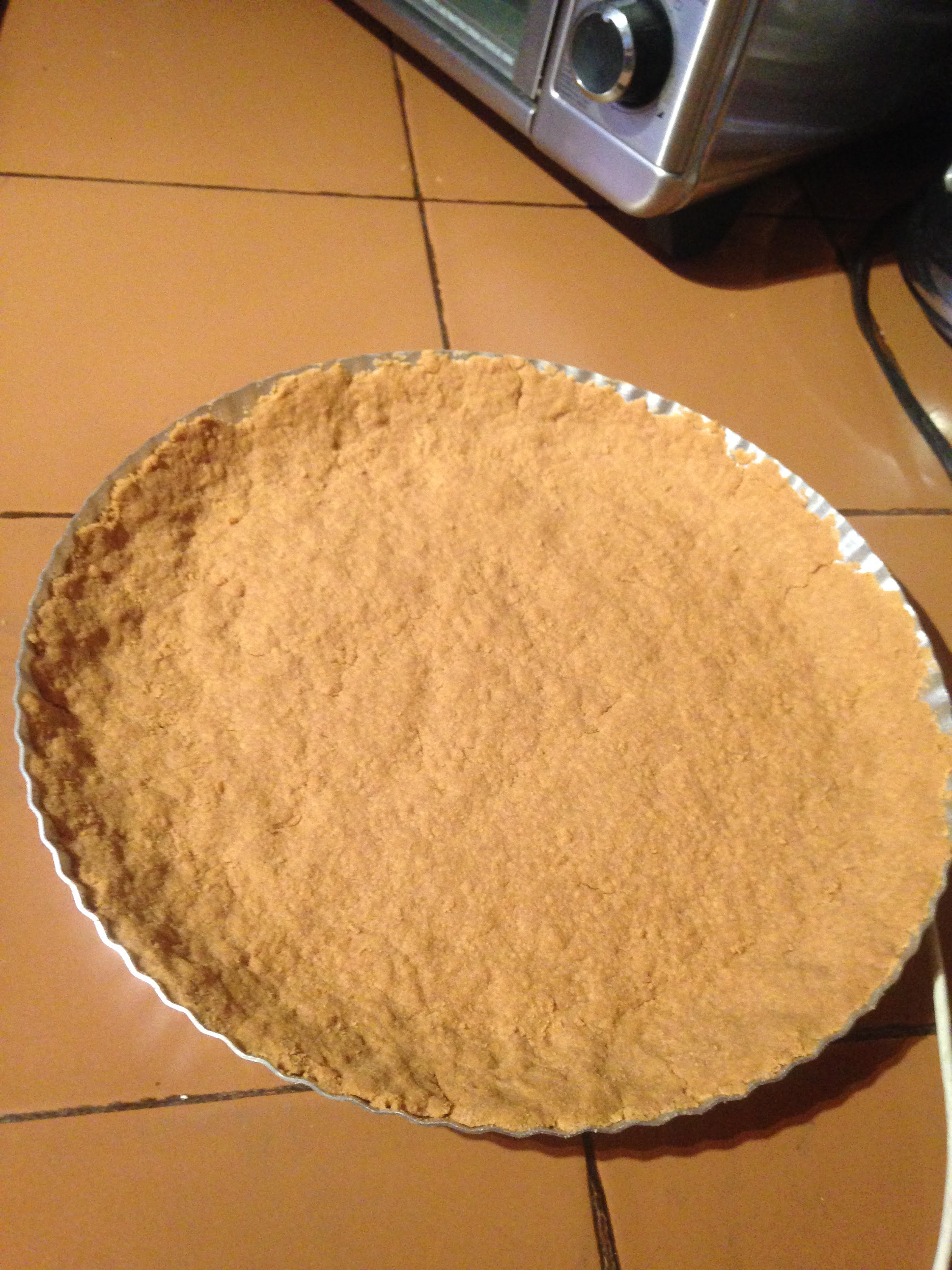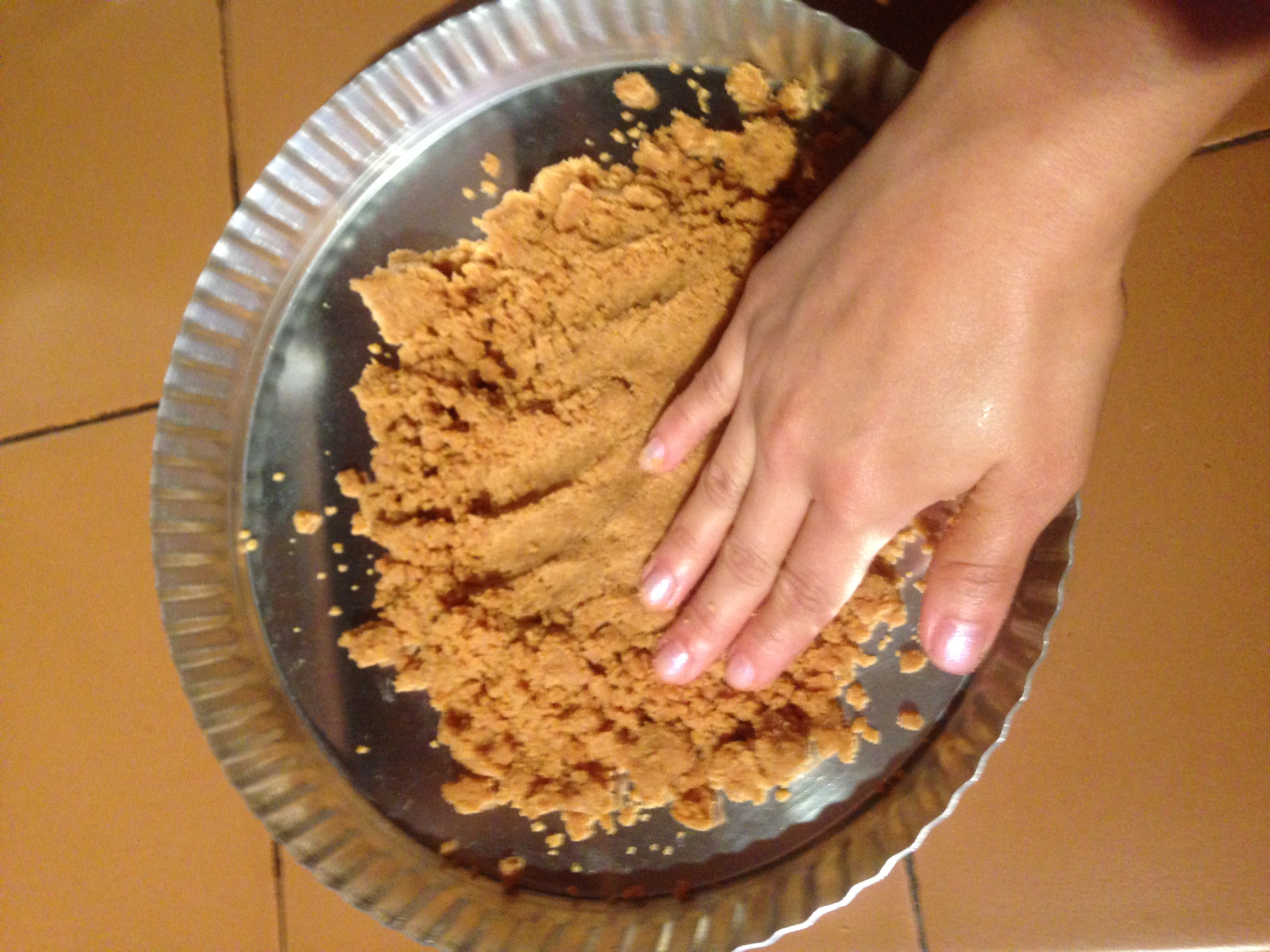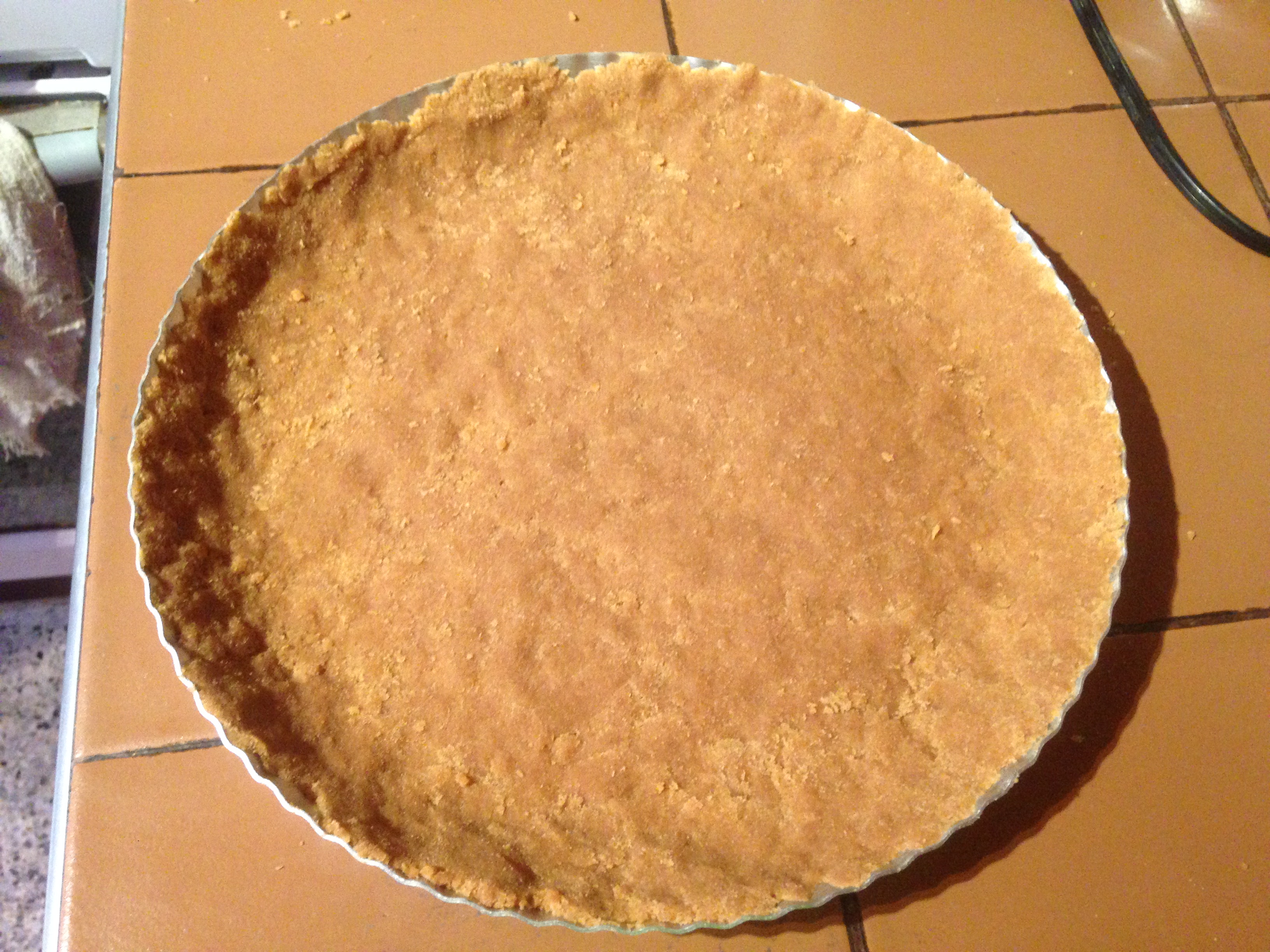 Derretir la mantequilla e incorporar a las galleta trituradas, mezclar hasta obtener unas masa compacta porosa que se une al apretar.