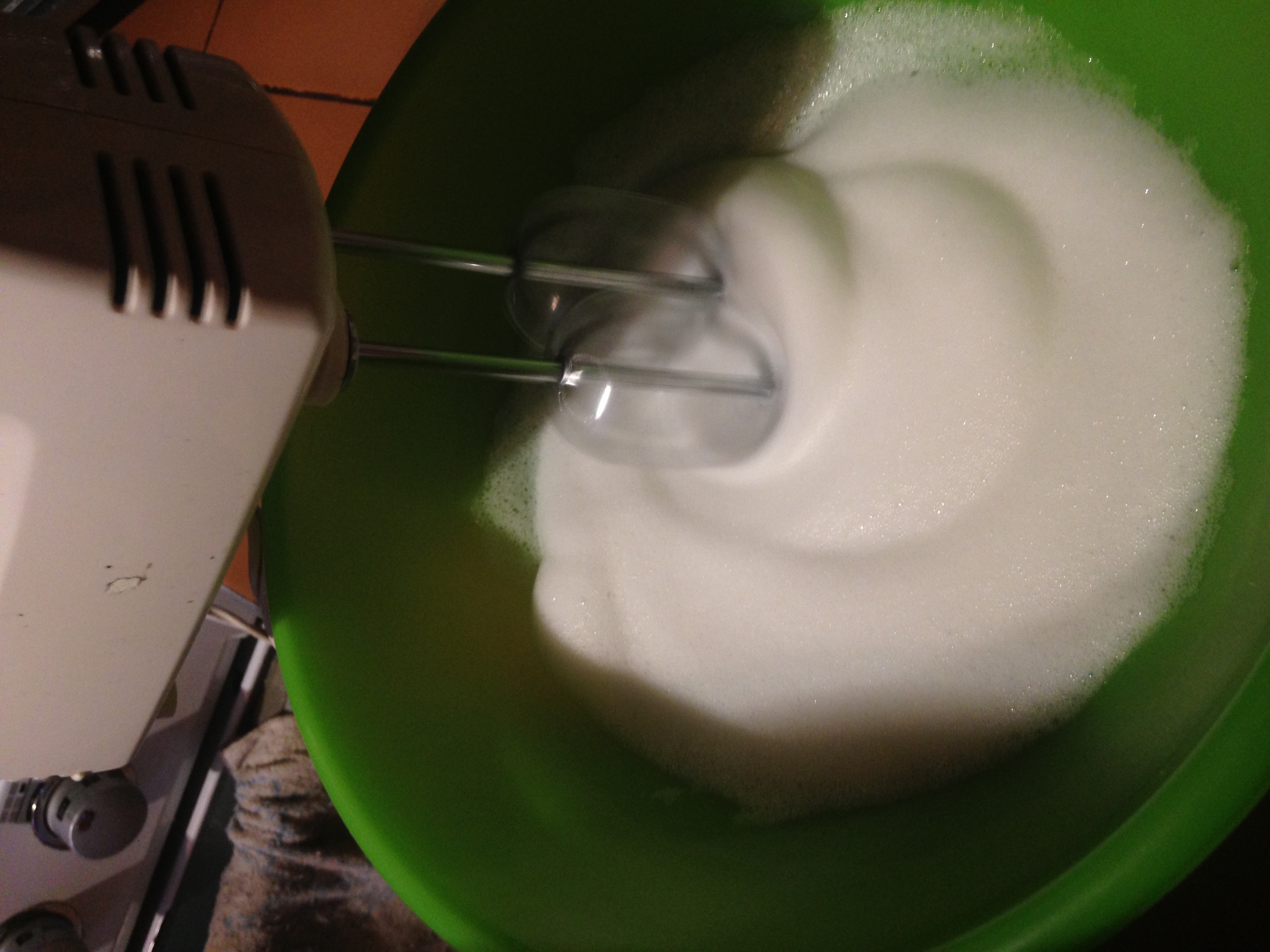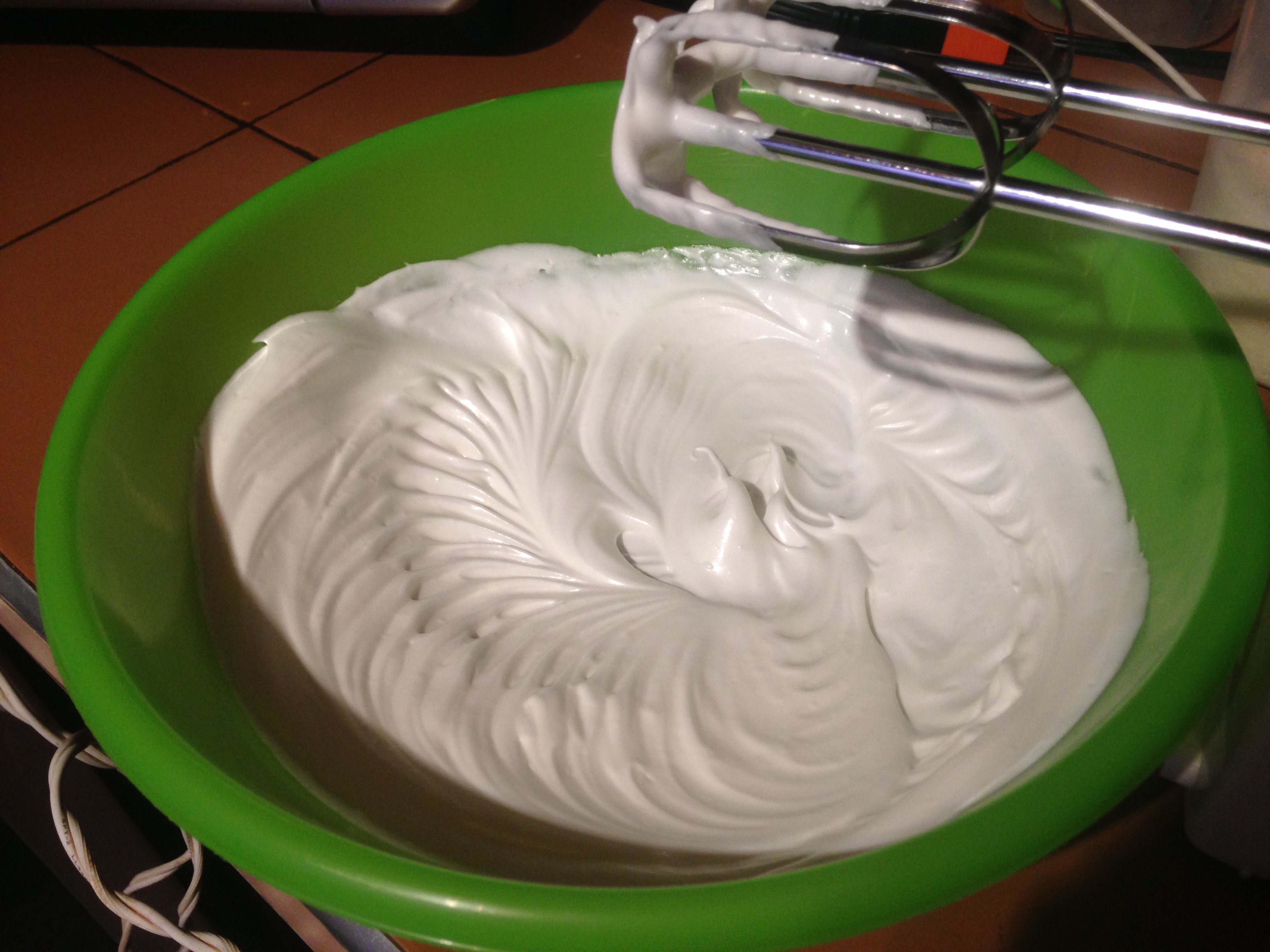Colocar la clara de huevo en un bol y batir hasta punto de nieve, luego incorporar el azúcar poco a poco, hasta que forme picos, por ultimo añadir una cucharadita de esencia de nata.