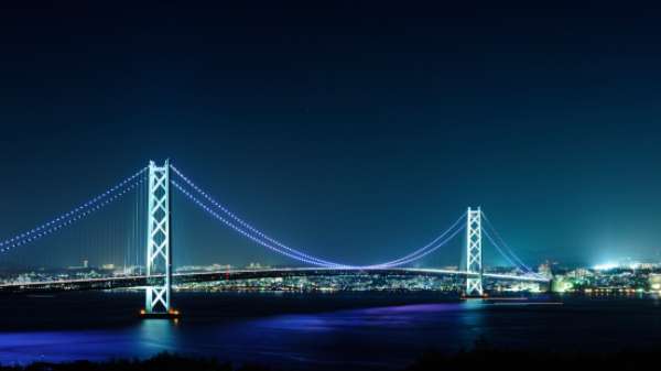 Es el puente colgante más largo del mundo, se llama así por estar ubicada cerca de la localidad del mismo nombre, une las islas de Honshu y la isla de Awaji y mide 4 kilometros de largo y 283 metros de altura, solo el sector entre las torres principales tienen 1991 metros.