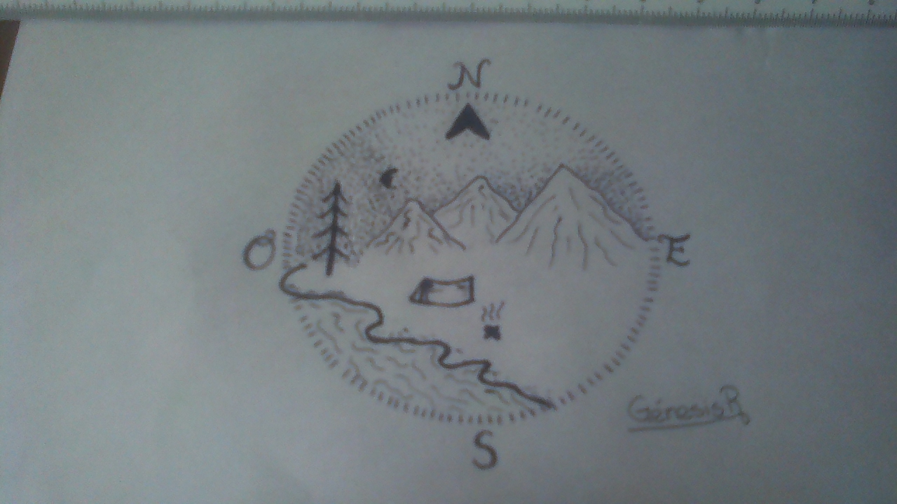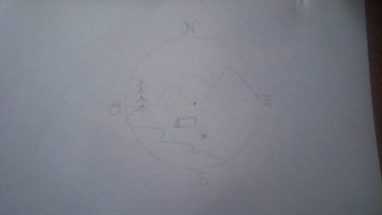 Empezamos a hacer las montañas, el rio, el árbol y las letras indicando el norte, sur, este y oeste. Todo este se haría usando el lápiz.