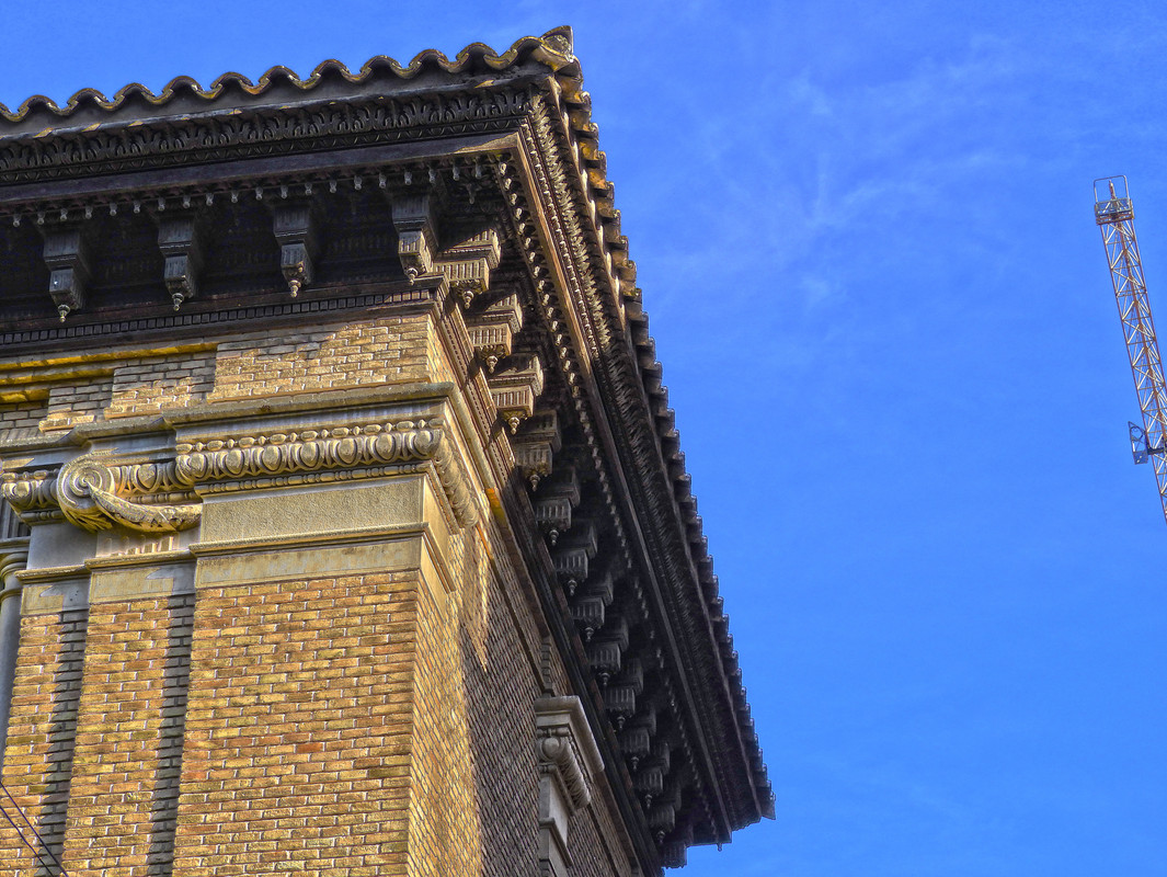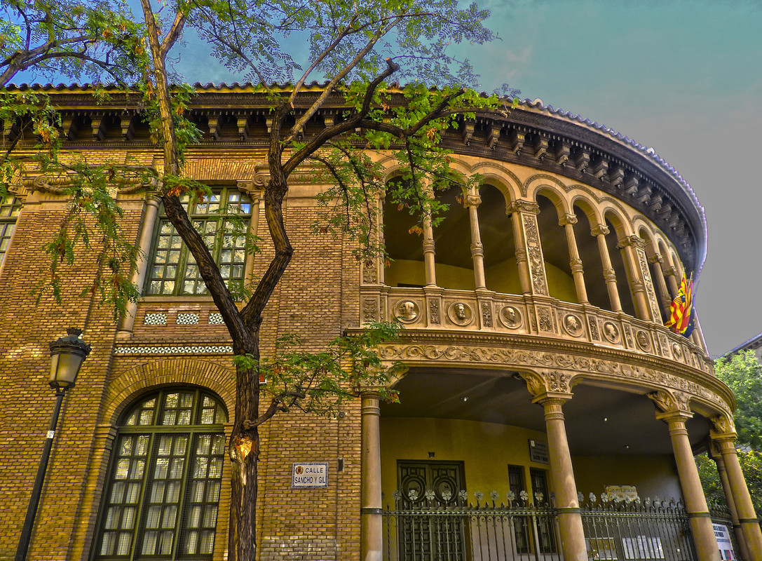 El chaflán curvo concentra la mayor parte de la decoración de fachada y reinterpreta los patios de palacios renacentistas zaragozanos trasladando su función de distribuidor interior por la de pórtico de acceso.