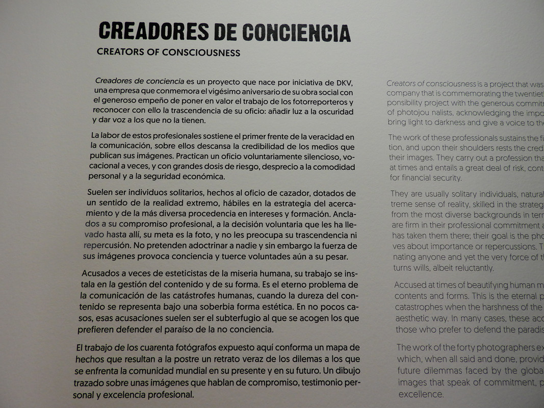 Las 120 fotografías que se presentan en la exposición "Creadores de conciencia" se han publicado en los medios de comunicación más importantes del mundo. Todas ellas están tratadas con seriedad y rigor y con un alma y una magia especial. Son obra de: Samuel Aranda, Bernat Armangué, Walter Astrada, Sandra Balsells, Lurdes R. Basolí, Javier Bauluz, Clemente Bernad, Pep Bonet, Manu Brabo, Olmo Calvo, Sergi Cámara, José Cendón, José Colón, Javier Corso, Ricky Dávila, Juan M. Díaz Burgos, Ricardo García Vilanova, Antonio González Caro, Diego Ibarra Sánchez, Sebastian Liste, JM López, Andoni Lubaki, Kim Manresa, Enric Martí, Andrés Martínez Casares, Maysun, Fernando Moleres, Alfonso Moral, Emilio Morenatti, Daniel Ochoa de Olza, Ana Palacios, Santi Palacios, Judith Prat, Abel Ruiz de León, Rafael S. Fabrés, Gervasio Sánchez, Carlos Spottorno, Rafael Trobat, Guillem Valle y Mingo Venero.
