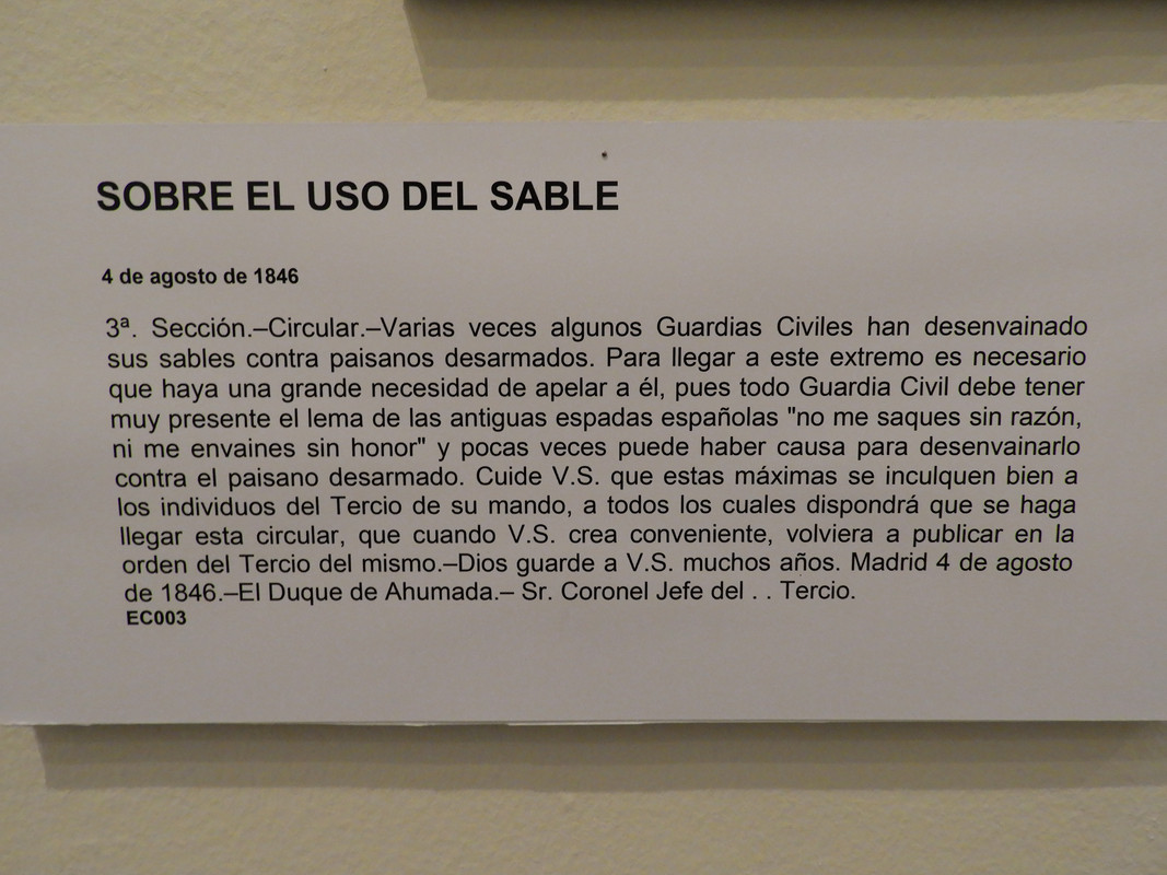 "No me saques sin razón, no me envaines sin honor". Así reza una circular de 1846 sobre el uso de los sables entre los oficiales de la Guardia Civil en Aragón. Esta es una de las piezas que se pueden ver en la exposición sobre los 175 años de la historia del cuerpo fundado por el duque de Ahumada que este verano se puede visitar en el Museo Provincial de Zaragoza.