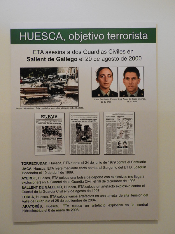 El recuerdo del dolor provocado por el terrorismo también tiene su espacio. Los nombres de los asesinados por ETA en los atentados de la Casa Cuartel de Zaragoza o en Sallent de Gállego ocupan un espacio preferente.
