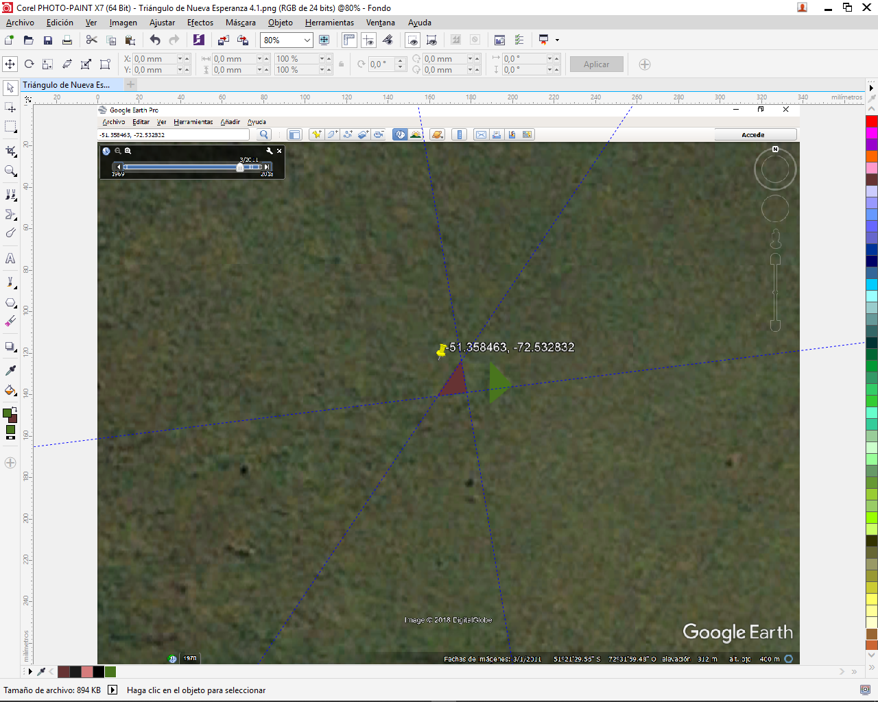 COORDENADAS EXACTAS: -51.358463, -72.532832 (Google Earth muestra el lugar en fechas anteriores a 2015 en la herramienta “Historial de Imágenes”.)