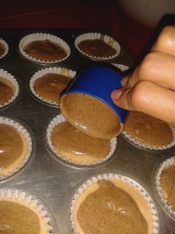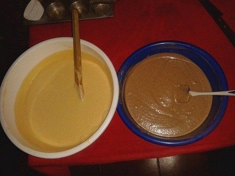 Colocamos en el molde los capacillos y vamos agregando la mezcla en cada uno de ellos, primero la mezcla de vainilla y encima agregamos la de cacao. Debemos dejar aproximadamente medio centimetro de espacio entre el borde y la mezcla porque ésta subirá al cocinarse en el horno.