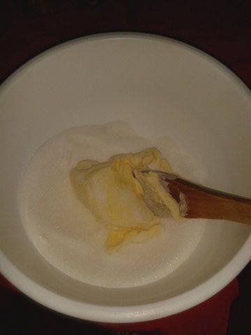 Comenzamos batiendo en un taza la margarina, que debe estar a temperatura ambiente, y el azúcar con una cuchara o paleta de madera hasta obtener una mezcla pastosa.