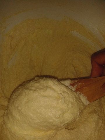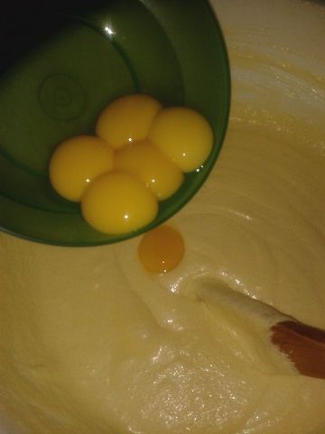 Agregamos uno a uno los huevos y vamos mezclando bien entre cada uno, luego agregamos las yemas de dos en dos hasta obtener una mezcla uniforme.