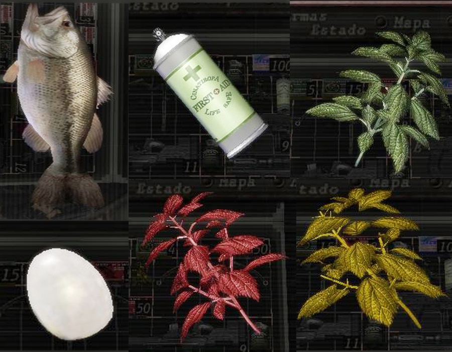 Sin lugar a dudas, una de las características más conocidas del residente Evil es sus famosas hierbas curativas, para esta saga solo tendremos 3 tipos de hierbas disponibles; los verdes son los más comunes que solo curan un 25% su salud, pero el porcentaje varía según el tipo de combinación que usted haga con otras hierbas; Los rojos no los obtienen con frecuencia y su uso es combinarlos con el verde para restaurar su salud al 100%; Finalmente tenemos el amarillo que combinado con el verde o el rojo cura tu salud un poco con la ventaja aumenta tu capacidad máxima de salud.