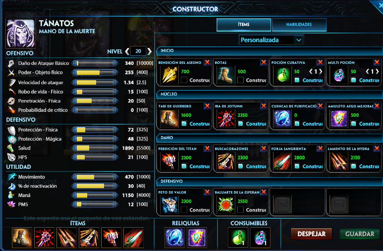 La pasiva de Thanatos le permite tener un robo de vida constante y este ítem es ideal para el a que cada vez que ejecutemos alguien obtenemos un escudo que nos dura 20 segundos, es muy útil ya al ser asesinos podemos tener más aguante durante las peleas además obtenemos +10% de velocidad de movimiento, +75 de poder físico y +15% de robo de vida físico.