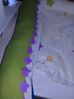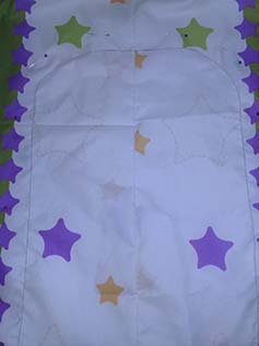 De seguidas con ayuda del patron marcar la parte central del colecho, ajustar con alfileres y proceder a coser, continuar con el relleno de ambas áreas del colecho (el borde protector se rellena con relleno de cojín o algodon sintético antielergico y el espaldar con la goma espuma o guata) tal como se muestra en la imagen y ajusta con el cordel.