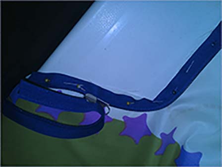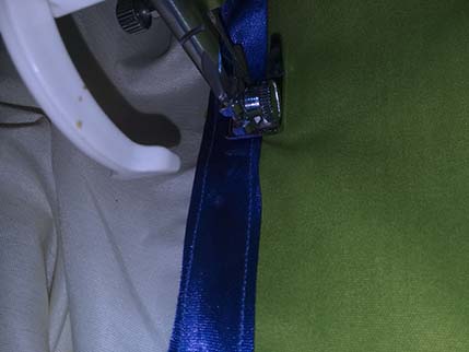 Para continuar y siguiendo la costura de la cremayera coser el resto del borde del nido o colecho, dar la vuelta al mismo. Coser por el borde del colecho la cinta o bies (esta costura se hará doble, es decir por cada orilla de la cinta) y con ayuda de una pinza o ganchillo introducir a través del canal que hicimos con la cinta, el cordel que servirá de ajuste al proyecto.