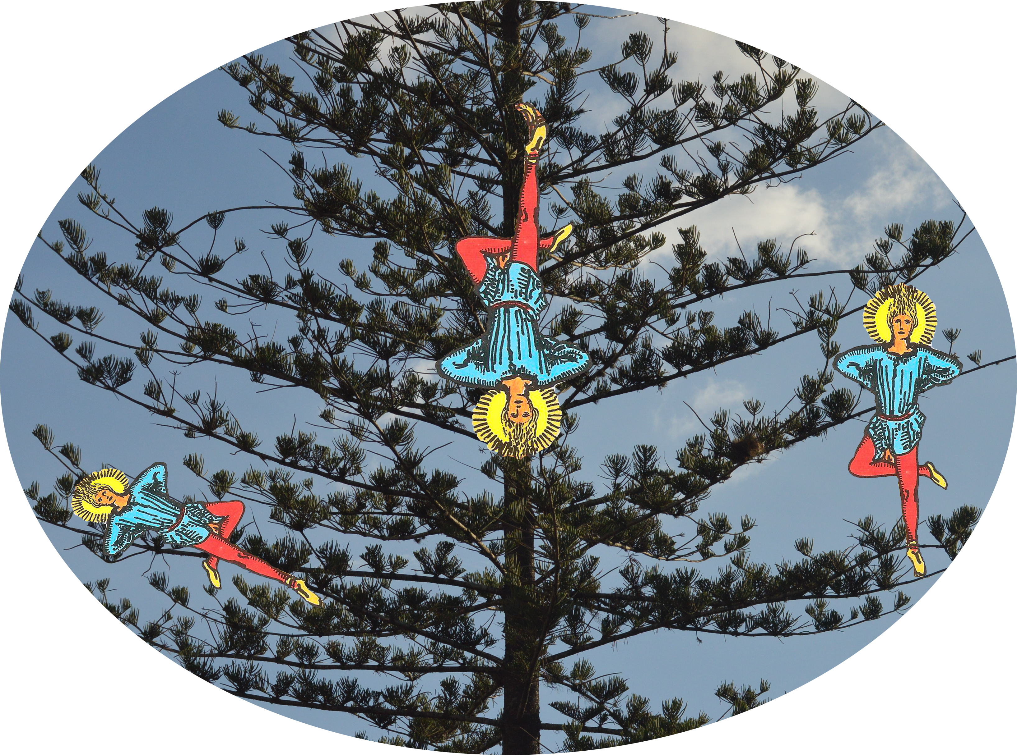 Ya no recuerdo en qué madrugada con exactitud comencé. De un momento a otro decidí -sin pensarlo mucho- hacerle intervenciones digitales a mis fotografías utilizando un elemento que aparentemente nada tiene que ver con ellas: las cartas del tarot. La motivación partió desde lo irracional, o sea, no había una explicación detrás de la primera imagen que hice (El colgado, el echado y el erguido sobre un pino), mi mente quería jugar y le di la oportunidad de hacerlo, independientemente de lo ocupado que estaba y estoy.