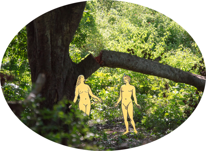 Fue imposible no pensar en el árbol roto de cotoperí que está en un terreno abandonado de mi familia para el entorno que envolvería a estos personajes bíblicos. No hace falta la representación del reptil corruptor, el pecado ya está hecho, la gran rama está rota.