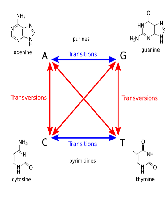 Para recordar estos cambios uso esta mnemotecnia: de pupu a pipi ocurre una transición (pupu→ cambio de purina a otra purina y pipi cambio de una pirimidina a otra pirimidina), por ende la tranversion es pupi (purina a pirimidina y viceversa).