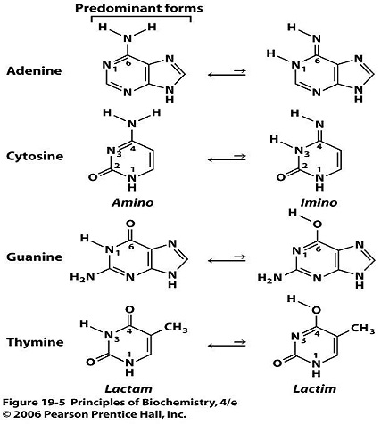 Observemos que cuando ocurre este cambio en la timina y la guanina su forma ceto, el doble enlace con el oxígeno en las posiciones 4 y 6 respectivamente, se protona formando un enol. En la adenina y la citosina pasa de una forma amino a una imino (un protón migra) esto trae como consecuencia que ya no se apareen C-G y A-T sino que ahora corresponda a T-G y C-A lo cual es grave ya que al replicarse el ADN ahora cambiara el emparejamiento de bases por ende mutaciones.
