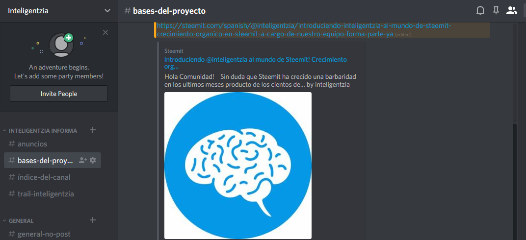 En el lado izquierdo puedes notar una barra con los Canales disponibles del servidor. Estos albergan tópicos divididos a su vez en categorías como los reportes del proyecto (Inteligentzia informa) y la sección general que abarcan los chats principales (usualmente el canal general-no-post es el que mas actividad tiene y es predilecto para solucionar dudas o empezar a interactuar con la comunidad.