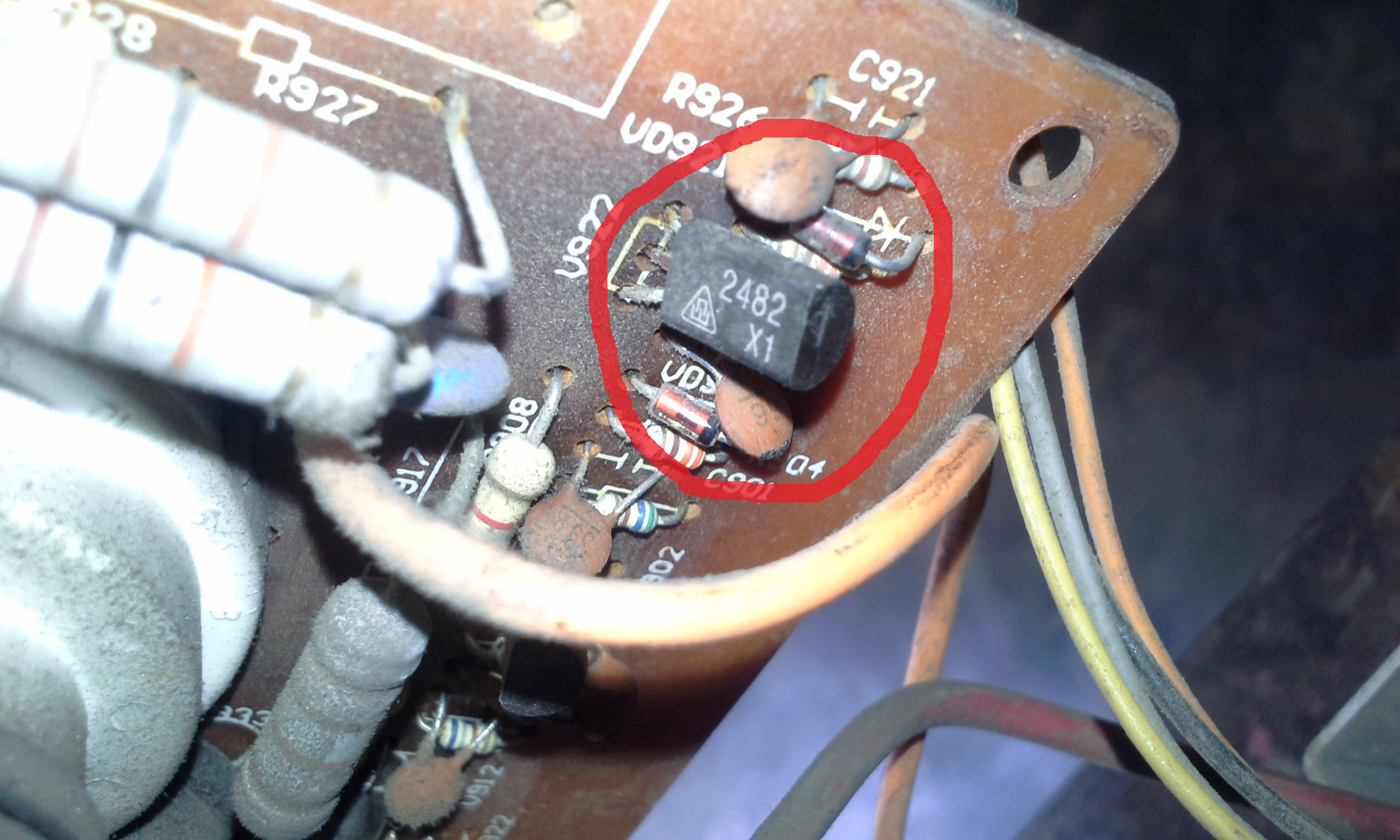 En la tarjeta c se encuentran alrededor de tres transistores estos se encargan de los colores, y si alguno de ellos no está haciendo un buen contacto, esto hace que los colores se alteren un poco, esta falla sucede cuando hay alguna subida de tensión causando que el estaño que une el transistor a la tarjeta c se despegue un poco y no haga un buen contacto afectando los colores del televisor.