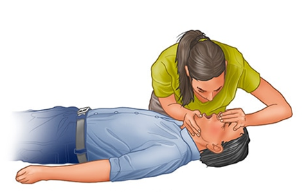 VENTILACIONES: Se deben realizar 2 ventilación cada 30 compresiones es decir al conteo de 30 compresiones ustedes de la manera más rápido se dirigirán a su cabeza y alzaran su mentón a un ángulo de 90° y taparan su nariz mientras abren su boca con sus dedos se colocan boca a boca y le ventilan 2 veces con suficiente fuerza. (Imagen 4).