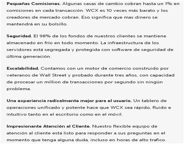 En la plataforma nos dice que WCX va ofrecer una experiencia profesional con comisiones 10 veces mas bajas que las demás.