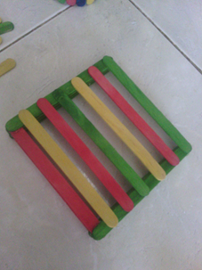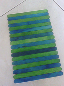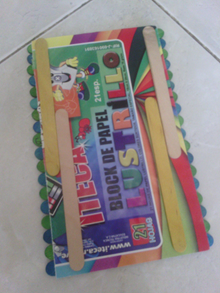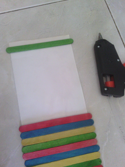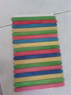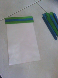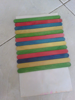 1.- Al tener nuestras paletas de helados a la mano, recortamos la hoja de reciclaje a la mitad. Debemos recortar estas hojas de tal forma que sea más corta que el tamaño de las paletas, es decir, que los extremos de las paletas sobre salgan de las hojas recortadas. Luego vamos pegando cada paleta hasta recubrir toda la hoja recortada. Observar las imágenes.