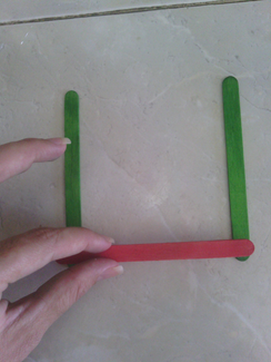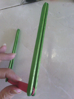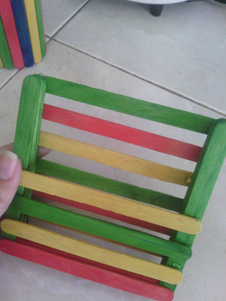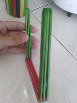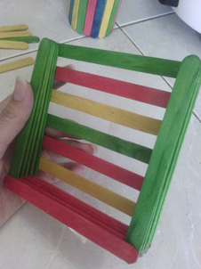 3.- Como tercer paso, empezamos a realizar lo que sería el porta celular. Tomamos 2 paletas verdes y encima de esta pegamos una paleta roja, luego encima de la roja pegamos 2 más verdes y así sucesivamente hasta que hallan 5 paletas rojas y un total de 10 verdes. Observar las imágenes para comprender como hacerlo.