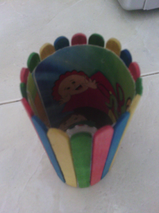 2.- Una vez lista esa hilera de paletas en la mitad de la hoja de reciclaje, la tomamos y pegamos los dos extremos para hacer una especie de cilindro. Esto sería el porta lápices.
