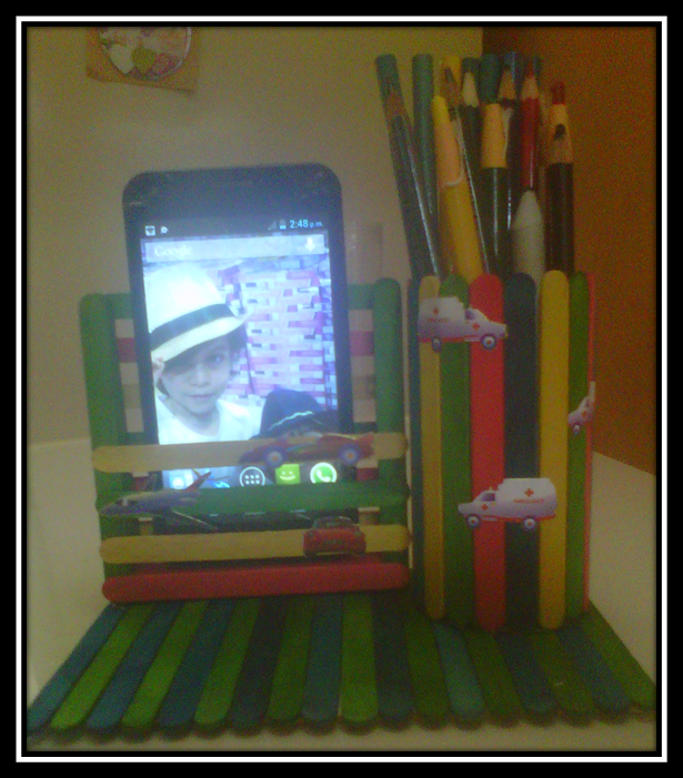 5.-Por último y para finalizar pegamos con nuestro silicón caliente el porta lápices y el porta celular y adornamos a nuestro gusto. Yo tenía unas calcomanías de carros y ambulancias, en lo persona a mis hijos les encantan y por eso adorne con ellas. Teniendo como resultado donde ubicar mis lápices para dibujar y mi celular.