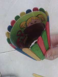 4.- Listo nuestro porta celular y el porta lápices, tomamos nuestra otra mitad de la hoja de reciclaje y hacemos el mismo procedimiento que al inicio, pegamos paletas hasta hacer otra hilera luego volteamos la misma y pegamos 4 paletas para darle la dureza suficiente y este actúe como base.
