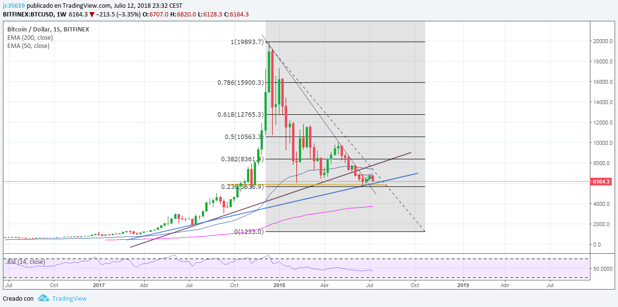 Que podríamos esperar del bitcoin a largo plazo. nos encontramos en los $6100 en estos momentos y encontramos un soporte en la zona de los 0.236($5600) fibonacci, si el precio toca dicho soporte y rebota podríamos buscar el punto 0.382($8300) fibonacci que seria nuestra resistencia fuerte. Pero si el soporte de los 0.236 fibonacci es roto con fuerza a la baja nuestro próximo soporte estaría en los $4500. Tenemos que aclarar que estos movimientos son de largo-mediano plazo ya que el marco temporal en el que se analiza en de semana.