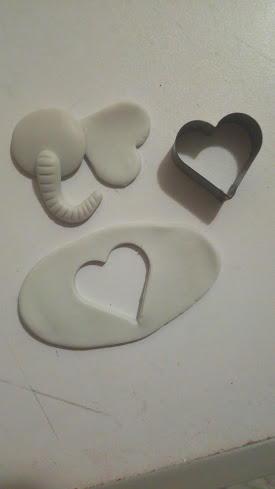 Orejas: Estirar masa, sacar en gris y rosado forma de corazón (ver foto) y pegar.