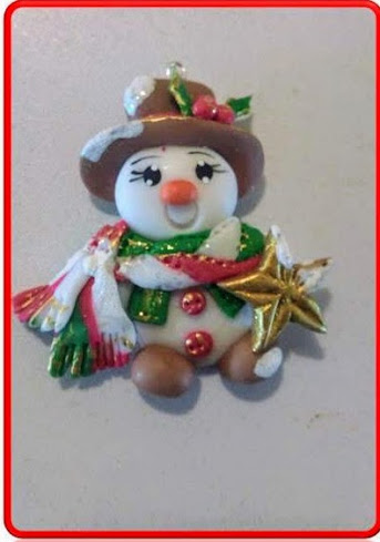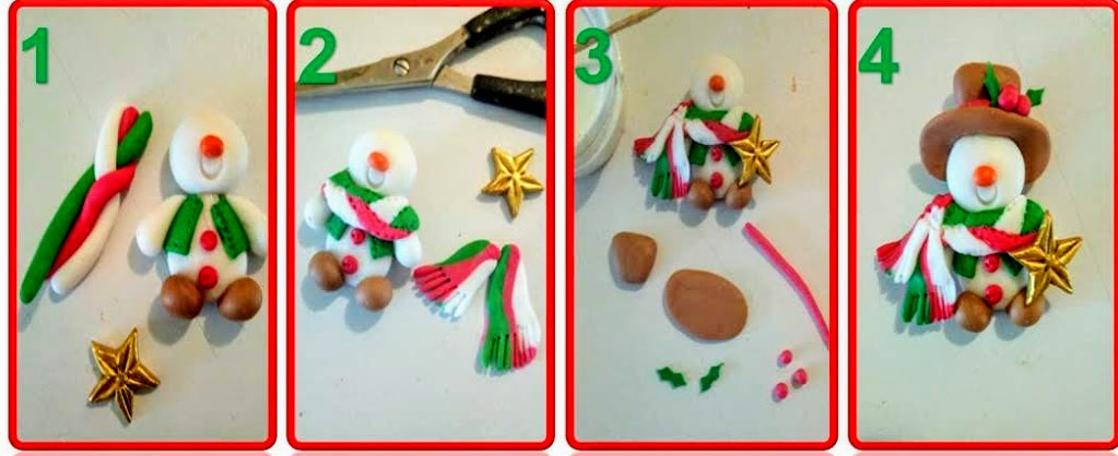 Para la bufanda se realizan 3 tiras de color rojo, verde y blanco y se procede a tejer en formar de clineja, pegar alrededor del cuello como se visualiza en la foto y para la otra parte de la bufanda se realizan 2 gotas, se moldea y con una esteca se texturiza y se pega como en la foto . Con un cortador de estrella sacar las figuras, pintar con oro calipso y pegar en el brazo y para el sombrero se estira masa en color ocre y se saca un círculo que es la parte inferior, para la parte superior se saca un rectángulo, se moldea y se procede a pegar y por último se decora el sombrero con una hoja (usando cortador de hoja).
