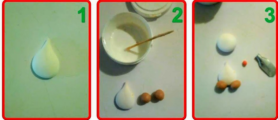 Para el cuerpo se toma una porción de masa color blanco y se realiza una gota. Los zapatos se realizan con 2 bolas de masa color ocre, se marcan con las estecas y se pegan. La nariz es una bola pequeña de masa en color anaranjado se moldea y se deja secar y la cabeza se hace una pelota con masa color blanco.