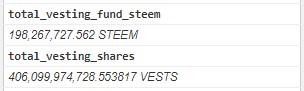 total_vesting_fund_steem: 198267727.562 STEEMtotal_vesting_shares: 406099974728.553817 VESTSreward_balance: 703878.279 STEEMrecent_claims: 369495749226.845013 VESTS