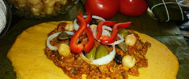 La hallaca: Es un tamal típico venezolano y su elaboración consiste en una masa de maíz pigmentada con onoto , rellena con un guiso de carne de res o de cerdo, gallina o pollo ,pimentón, aceitunas, uvas pasas, alcaparras, cebolla , zanahorias y papas.