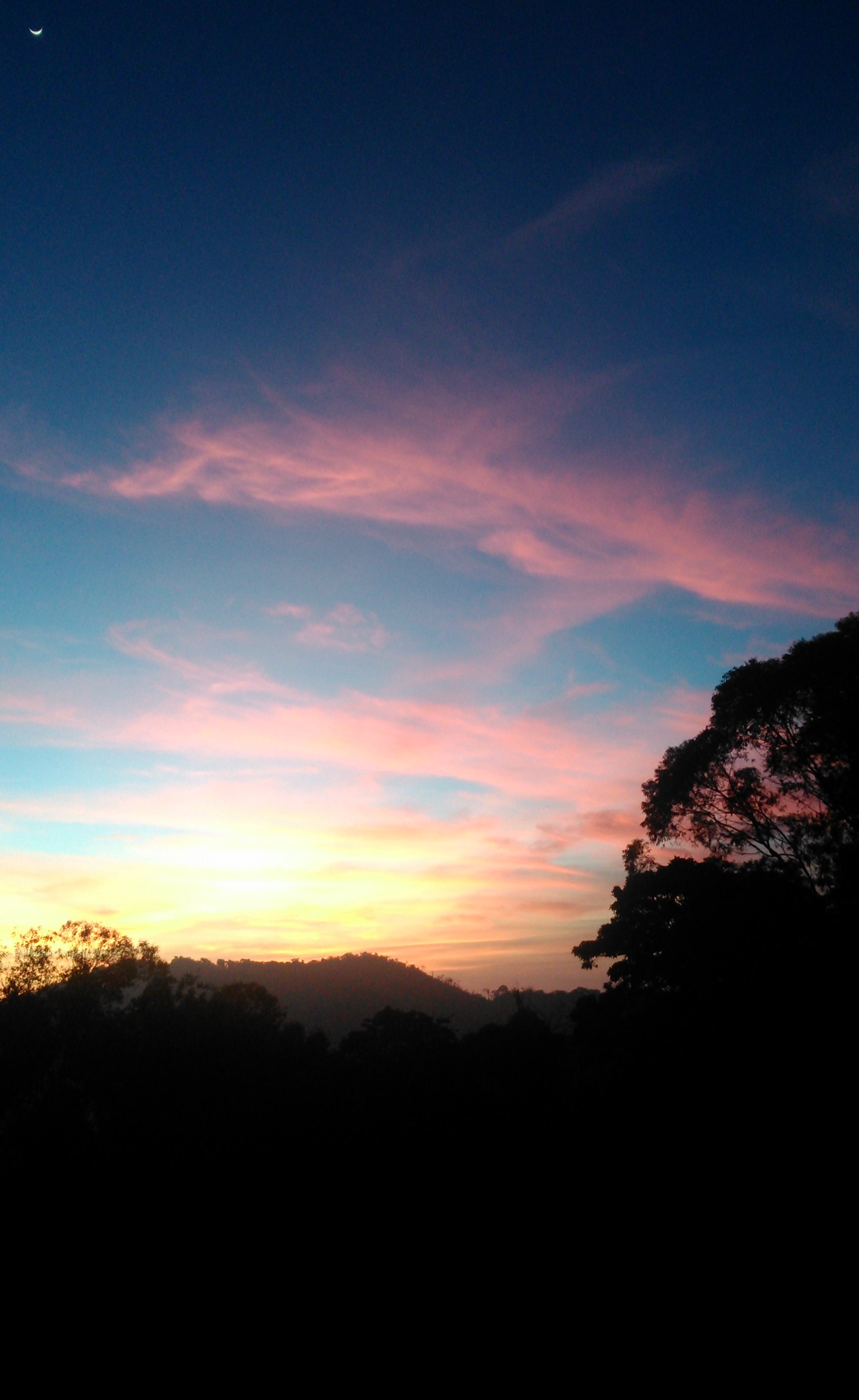 Si me preguntan lo que me gusta de esta foto son los trazos de colores que hacen perfecta armonía con la oscuridad de los arboles , es bonito un contraste. También me gusta como se ve la luna en una esquina, cuarto creciente pequeña pero como con ganas de hacerse notar.