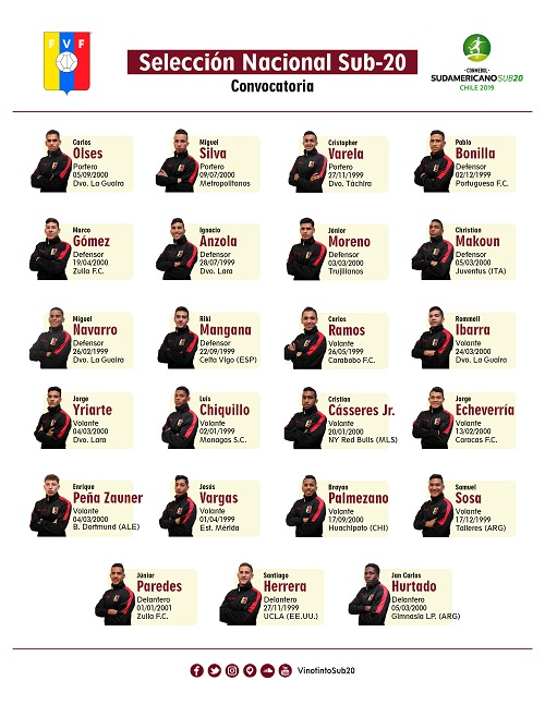 El debut de la Vinotinto se daría el jueves 17 de enero ante la selección de Colombia. Entre los jugadores convocados a destacar en este sudamericano tenemos a: Samuel Sosa, un volante creativo que hace vida en argentina y quien fuera el protagonista de uno de los mejores partidos de la selección en el mundial Sub 20 en el cual salimos Sub campeones, Hurtado quien sera el delantero estrella de esta selección, al igual que Sosa formo parte de otros procesos con Dudamel, Palmezano otro volante creativo que en anteriores torneo dejo muy en claro la calidad que posee y para cerrar nuestro capitán Makoun, un jugadorazo que me encanta como juega en el medio campo de 5 u 8 pero en esta selección fue reconvertido a central, debido a las necesidades del equipo y de la solvencia con la que cuenta este jugador en la marca.