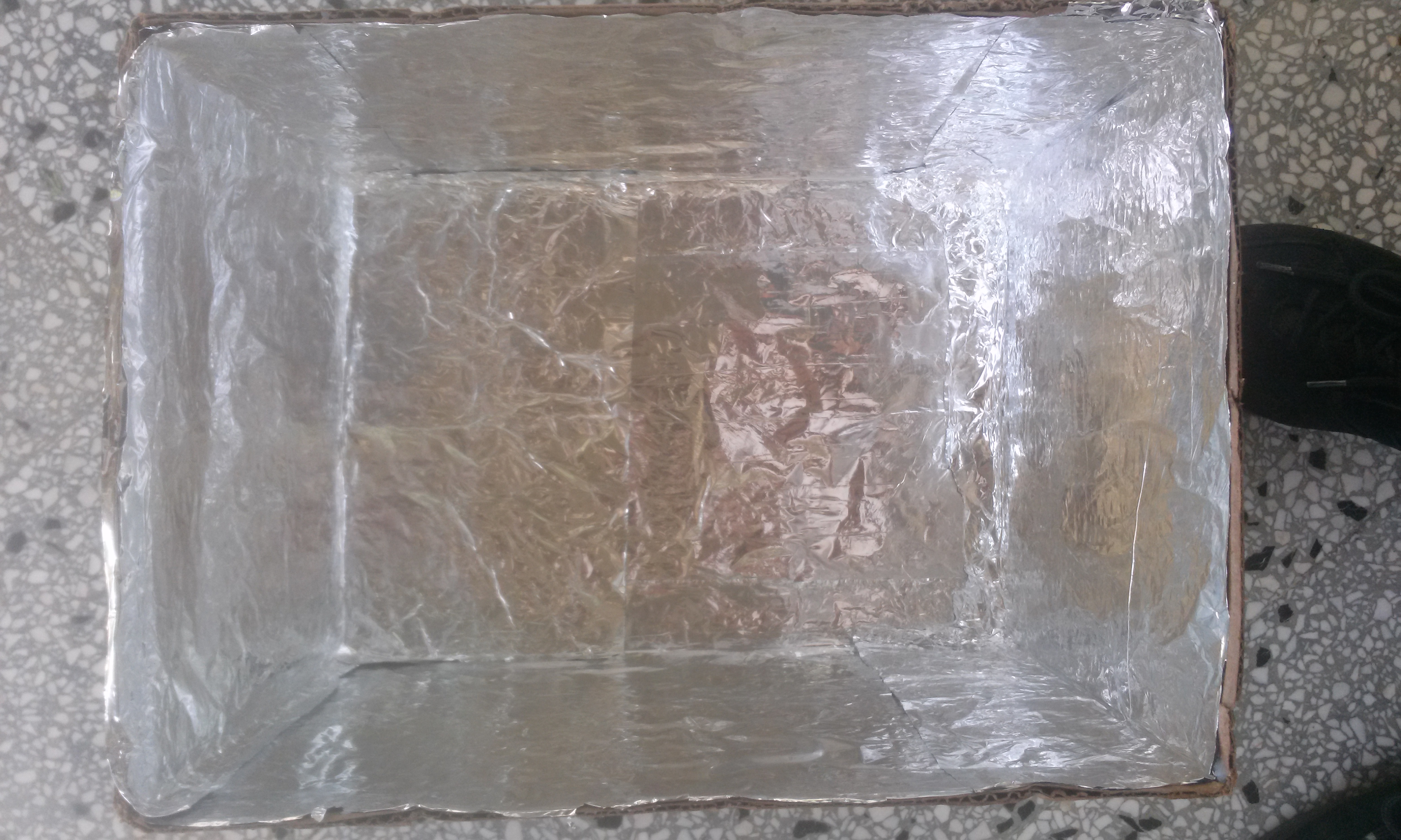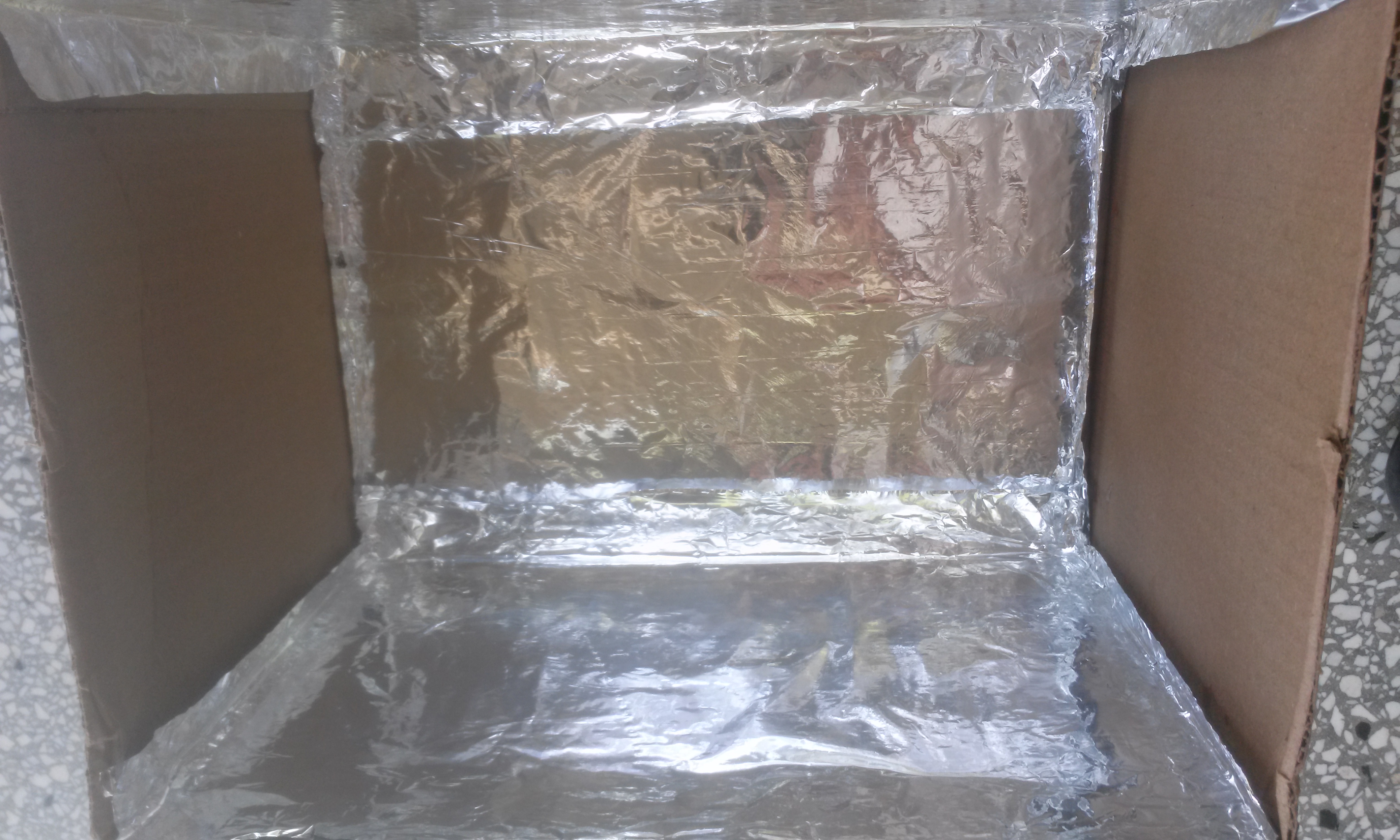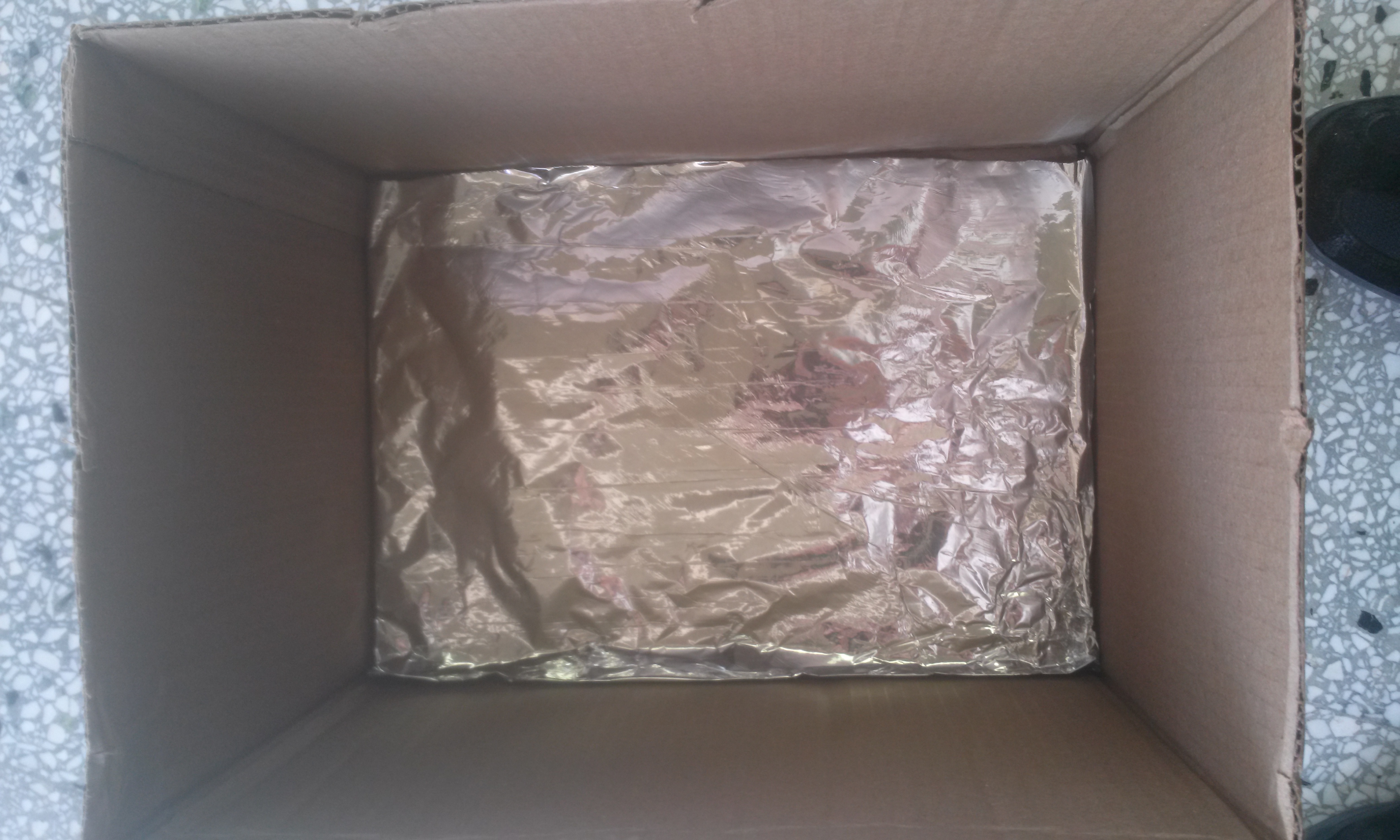 3). Procede a cortar el papel aluminio y forrar las paredes internas de la caja, sin dejar ningún espacio libre de papel.